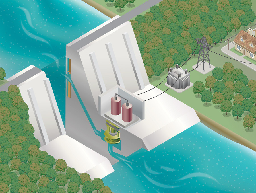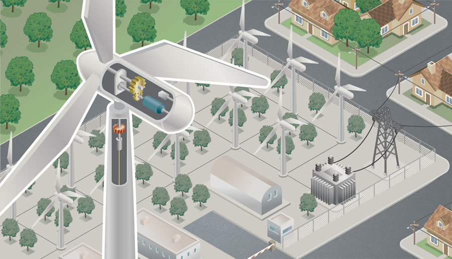 Ilustrações isométricas de 4 diferentes formas de gerar energia.