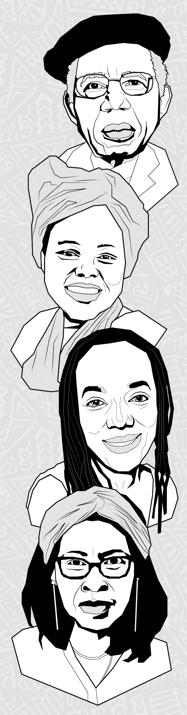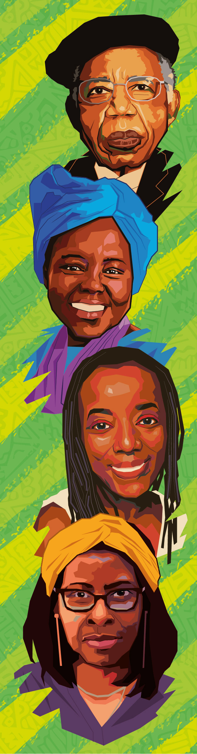 Portrait of Chinua Achebe, Paulina Chiziane, Tsitsi Dangarembga and Scholastique Mukasonga.
